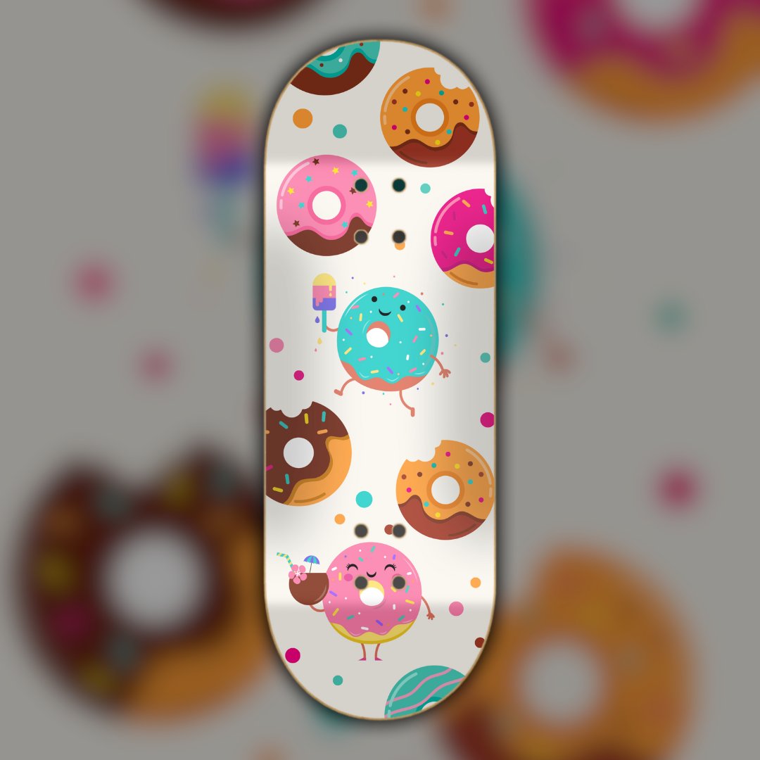 Real wear wooden fingerboard deck featuring the Donuts graphic — handcrafted in Switzerland with precision, style, and soul. Each deck is custom-made to your specs using premium materials and refined techniques, built for riders who value true craftsmanship.